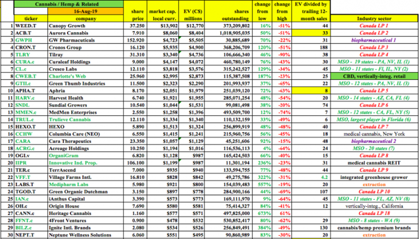 The companies that make it to the big leagues will be prime takeover targets next year by the top 50 players, 30 of which I show below. Notice there's just one hemp/CBD focused name in the top 30, Charlotte's Web.